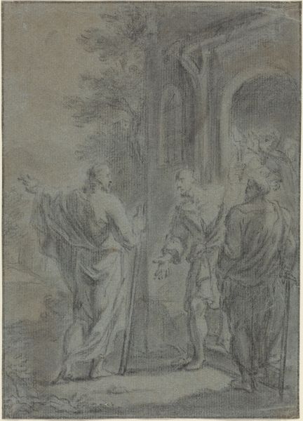 Curator: At first glance, this drawing evokes a sense of serenity. It's all flowing lines and gentle light, almost like a dream captured on paper. Editor: Indeed. What you are sensing may well be attributed to Giovanni Odazzi, an Italian artist who made this artwork, “Allegory with two female figures, one representing Faith holding a coat of arms” between 1663 and 1731. It’s rendered in pencil, which gives it a certain lightness. The artwork resides here at the SMK, the Statens Museum for Kunst. Curator: "Allegory" is definitely the key word here. I’m drawn to the figure of Faith – the one with the radiant symbol on her chest and presenting the coat of arms. To me, it represents an interior strength, the embodiment of belief made visible through these iconic devices. How did you read that moment? Editor: The positioning of the two women interests me—one standing and gazing toward divine light, and the other kneeling with the arms. The relationship implies a hierarchy in which celestial validation, through the winged messenger hovering at the column’s crest, elevates earthly heraldry. We often find noble families deploying art for social capital, connecting lineage with a perceived divine will to reinforce their status and control narratives. Curator: That’s an interesting perspective. I am especially struck by the sun emanating the image with bright light in the upper corner; perhaps suggesting a transition, a movement away from the darkness, where shadows used to be toward something more illuminated and guided? The Faith figure could also stand in the presence of institutionalised, noble systems which give rise to new orders based on light and clarity, yet retaining and recognising familiar structures. Editor: I wonder how deliberate this blending of iconographies was by Odazzi and what kind of cultural impact was trying to convey. He, like many artists, navigated between wealthy patrons and religious institutions—a tightrope walk which necessitated subtlety in the symbolism, as personal liberties remained curtailed by demands for prescribed iconography. It leads me to wonder if this heraldic promotion also accommodated more esoteric or ambiguous concepts related to virtue or fortitude. Curator: Well, it seems the longer we gaze at these visual forms and hidden allusions the more nuanced questions about history and faith take shape around such an image! Editor: Agreed! It's a testament to how a single sketch can embody the socio-political complexity of an era while simultaneously inviting modern-day speculation.