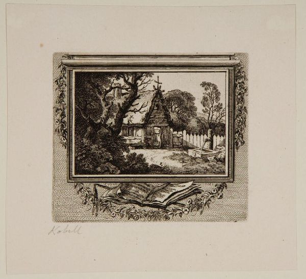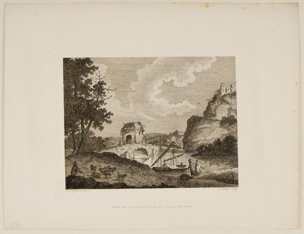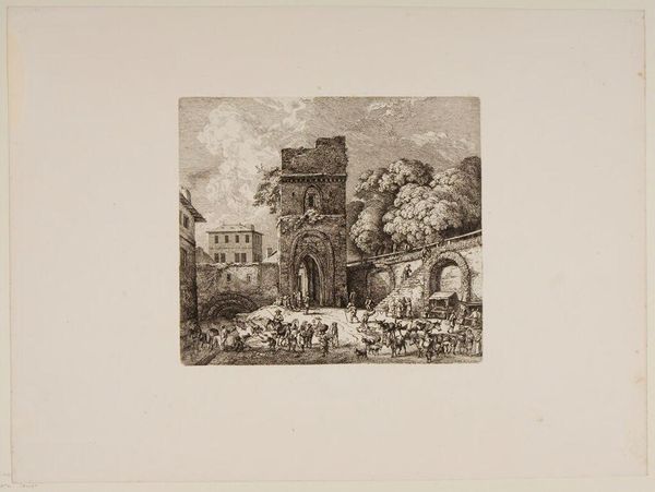 Editor: Here we have Ferdinand Kobell’s "Gate Leading to a City on a Hill." It's an etching, and it feels almost dreamlike, like a memory of a place. What do you see in this piece? Curator: I see a loaded landscape, ripe with the politics of access. Who is allowed through that gate? The figures seem to be laborers, suggesting a hierarchy where some are granted entry while others serve. Consider the "city on a hill" trope, often used to justify exclusion. Editor: So, the title itself might be a commentary? Curator: Precisely. Kobell invites us to question these idealized visions of society. What does a 'perfect' city cost those who build and maintain it from the outside? It's about power, class, and who gets to define utopia. Editor: I never considered landscape art could be so critical! Curator: Art is always a reflection of its time, and often a challenge to it. Looking closer, we can uncover these hidden layers.