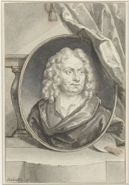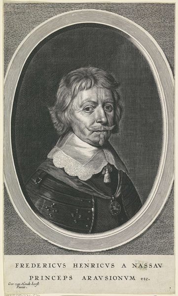 Curator: Before us we have Theodor Matham’s "Portret Johan de Brune" from 1656, held here at the Rijksmuseum. Editor: It strikes me immediately with its almost unsettling realism, achieved solely through meticulously applied lines. The details seem amplified by the monochrome. Curator: Absolutely. As a print, the image has fascinating implications in terms of access and distribution, allowing wider societal access to portraits that were previously limited to the elite. And Matham's choice to depict Johan de Brune, a lawyer and writer, places intellectualism at the forefront. Editor: The rendering is what commands attention. The way the artist employs hatching and cross-hatching to model the face, especially around the eyes and mouth, communicates volumes. Do you notice the almost architectural quality of the surrounding decorative elements? Curator: Yes, the frame mirrors the man himself! De Brune’s career was marked by navigating the complex political and religious landscape of the Dutch Golden Age. His writings reflect his own journey toward religious tolerance, influencing contemporary debates. Editor: So the portrait is, in effect, presenting his intellectual persona. Still, it is Matham's handling of the line, creating varying densities and textures, which holds the composition. See how the formal severity and intensity create almost palpable presence? Curator: He also worked during a period of immense social and economic upheaval, and his life experiences are woven into this very artwork through the intricate symbolism of attire and accessories! Consider, the lace collar signifies status while simultaneously hinting at the constraints placed on the individual. Editor: So much from such precise lines! This really illuminates how much expressive power is found in the smallest detail of artistic technique and cultural significance. Curator: Indeed, a look into the historical conditions of a very tumultuous time in the Dutch Republic! Editor: Precisely. We can truly understand the complex layering of symbolic weight from an earlier century as a result of this nuanced study.