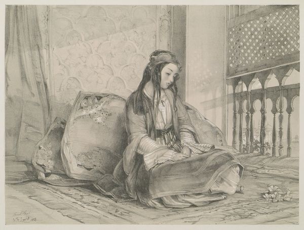 This is John Frederick Lewis's "Turkish Female," a work that immediately draws us into its intimate and enclosed space. Rendered in delicate strokes, the composition centers on a seated woman, framed by the architectural elements of an interior. Lewis masterfully plays with light and shadow, which articulates the texture of the fabrics and the cool stillness of the room. This careful use of light not only enhances the visual depth but also subtly hints at the cultural narratives embedded within the scene. The semiotic weight of the depicted objects—the ornate screen behind her, the slippers placed near her cushion, and the smoking set to the bottom right—these details create a rich tapestry of signs. They invite us to consider the broader cultural codes that informed how Lewis, and his audience, perceived this foreign 'Orient.' What meanings are assigned to gender, domesticity, and luxury within this constructed view of Turkish life? By focusing on these formal elements, we can see how Lewis’s artwork operates not just as a visual representation but also as a complex engagement with cultural representation. It prompts us to question the artistic and historical context that shaped the construction and interpretation of such imagery.