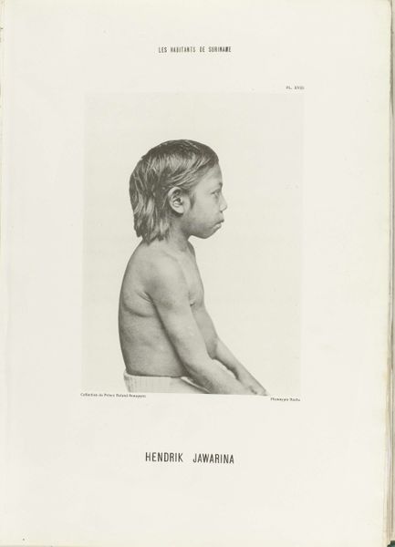 Curator: Standing before us is a photograph by Friedrich Carel Hisgen titled "Portret van Awarahena," created between 1883 and 1884. It’s currently housed right here at the Rijksmuseum. Editor: Awarahena. What a melodic name. The first impression is one of quiet contemplation, isn’t it? There’s a stark simplicity in the image, and I feel this strong sense of direct gaze, even though it's a profile. There’s a whole story whispered here, right? Curator: Absolutely. This portrait is a part of a larger colonial project attempting to classify and document people indigenous to Suriname. What interests me is the intersection of photographic realism and scientific objectivity, alongside underlying power dynamics. Editor: I'm captivated by Awarahena's youth and expression. I wonder about his inner world— what was it like for him being viewed and viewed again decades later in this way? A melancholy question to sit with, wouldn't you say? His stance carries an air of subdued dignity. And it gives us a bit to think about ourselves in return... Curator: These images, sadly, became tools for constructing narratives about colonized peoples. However, looking at "Portret van Awarahena" in a contemporary light encourages a re-evaluation of colonial history and power. We're reminded of its role in shaping both knowledge and social control. Editor: Absolutely. I sense both vulnerability and surprising resilience. Like looking through a glass: part documentation, part feeling – like two reflections trying to co-exist. It makes me think we have this obligation to let images breathe outside what we assume or expect from it. Awarahena has become an ancestor now, someone whose beauty will not just disappear... Curator: Indeed. It prompts necessary and complex discussions on the ethics of representation in photography, doesn't it? Editor: Without a doubt. Hisgen's photo is undeniably a reminder that images contain much more than their initial framing could convey. The boy may remain silent in the portrait, but as long as we have him in sight he is never really still.