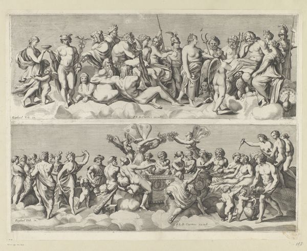 Giovanni Lanfranco created this etching, Jozua beveelt de zon en de maan stil te staan, sometime in the 17th century. Observe how the compact composition bursts with chaotic energy through dynamic lines and a densely packed crowd of figures. Lanfranco masterfully employs the etching technique to create depth and texture. Note the contrast between the darker, heavily etched areas that define the foreground figures and the lighter, sketchier lines used to depict the background. This contrast not only enhances the sense of depth but also focuses our attention on the immediate struggle. The figures, caught in dramatic poses, draw heavily from classical art. Lanfranco's work reflects the Baroque era's interest in movement, emotion, and the sublime. The scene's disorder reflects a shift from Renaissance ideals of balance and harmony toward a more dynamic, emotionally charged aesthetic. The image invites us to consider how even within the confines of religious narrative, artists could explore new modes of expression that challenge fixed meanings and celebrate the intensity of human experience.