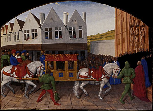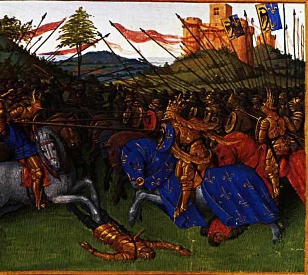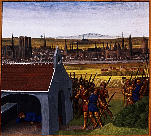 Curator: The sense of determined momentum practically bursts from this painting, doesn't it? Editor: Indeed. Before us, we have "Taken in Tours in 1189," an eye-catching tempera on painting by Jean Fouquet, dating back to approximately 1460. There's a definite energy radiating from it, though the visual hierarchy does feel slightly off-kilter to my eye. Curator: Off-kilter in a way that makes it more human, perhaps? More chaotic, less...divine? Those scaling the walls give a vivid sense of how battles unfolded—the medieval art world has a certain charming brutal honestness that makes historical subjects relatable. Editor: The figures clinging to the walls of Tours do command attention; their placement guides our eye rhythmically, top to bottom. Note also the calculated juxtaposition of flat, decorative patterning in the foreground with the suggestion of depth in the architectural rendering. And have you noticed that despite its small scale, the sheer architectural presence in the background creates an oppressive mood? It’s as if the city itself looms, observing. Curator: Absolutely! I love the sense of depth Fouquet managed. There's something incredibly poignant about how small those soldiers look compared to the stone city, as if the entire scene speaks of man's aspirations of legacy. I imagine Fouquet, lost in these epic reflections. Editor: Fouquet manipulates a range of symbolic motifs effectively, if traditionally for his time, it has to be admitted. The dominance of the fleur-de-lis motif certainly telegraphs the preeminence of the French monarchy in this tableau of urban conquest. The ladders against the walls present an engaging case-study in Fouquet's arrangement of horizontal and diagonal forms too, a powerful counterpoint to the verticals elsewhere. Curator: I can almost smell the straw, hear the neighing horses, feel the cool of the stone… It all serves as an incredible testament to the past. Editor: Ultimately, Fouquet's "Taken in Tours in 1189" invites us to reconsider conventional perspectives on historical events—an achievement in spatial economy and visual narrative.