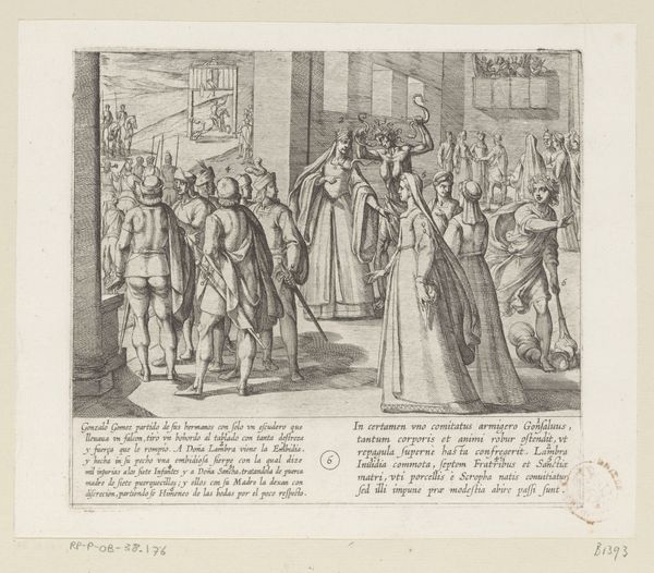 Editor: So, this etching by Antonio Tempesta is called "The Infante Gonzalo Gomez Excels at the Game and Dona Lambra Insults the Infants and Their Mother." It feels strangely theatrical, almost like a stage play unfolding. What kind of story do you think Tempesta is telling here? Curator: It's a story dripping with rivalry and scorn. I see it as Tempesta’s way of reflecting on the poisonous nature of envy and the consequences that come when social decorum breaks down. Does the woman with snakes for hair perhaps remind you of another figure in classical mythology? Editor: Medusa! Is Dona Lambra supposed to be like Medusa here? Curator: Perhaps, as Envy is breathing poisonous insults at the seven princes and their mother. This print seems to be a morality tale served up with a dash of visual drama. Editor: I didn't catch all of that before. Now I see the story he's trying to weave!