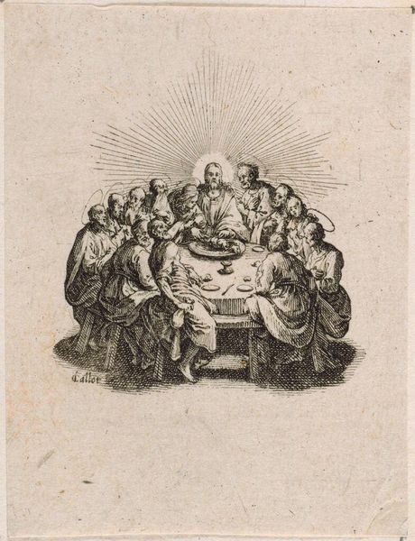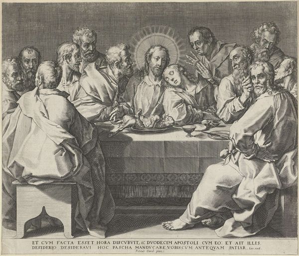 Curator: Let's turn our attention to Nicolaes de Bruyn's "Laatste Avondmaal," or "The Last Supper," an engraving from 1618 currently residing at the Rijksmuseum. Editor: The mood is instantly heavy, don't you think? There’s a distinct tension created by the almost theatrical use of perspective and the figures clustered so closely. Curator: Precisely. De Bruyn utilizes the graphic power of line to compress the emotional weight of the scene into a highly structured composition. Consider how the lines converge, guiding your eye directly to Christ. Editor: It’s hard not to. But looking beyond the immediate religious narrative, I’m struck by how the piece encapsulates the social anxieties of its time. This gathering, so pivotal, feels shadowed by betrayal. Even the lighting contributes—aren't the faces rendered in ways that hint at conflict, suggesting the fissures within the group dynamic? Curator: I understand your point. Certainly, elements like the somewhat austere interior add to a reading beyond purely devotional content. Note the attention to detail, though: the textures rendered through varied engraving techniques, adding visual richness and hierarchical significance to the primary figures in the composition. Editor: Those subtle yet critical gradations in texture do underscore the implicit hierarchy and relationships of power among those present. Isn’t that what makes the work endure, its ability to reveal those enduring and timeless conflicts between faith and betrayal, inclusion and exclusion? It's a complex statement on community and power. Curator: De Bruyn was adept at distilling complex theological narratives into a concise visual form. The engraving stands not only as a testament to the skill of Northern Renaissance printmakers but as a compelling formal and thematic rendering of an iconic moment. Editor: And, arguably, how the themes it presents still resonate profoundly within contemporary society. It is a complex, if familiar, reminder of the shadows that lie beneath seemingly tranquil surfaces.