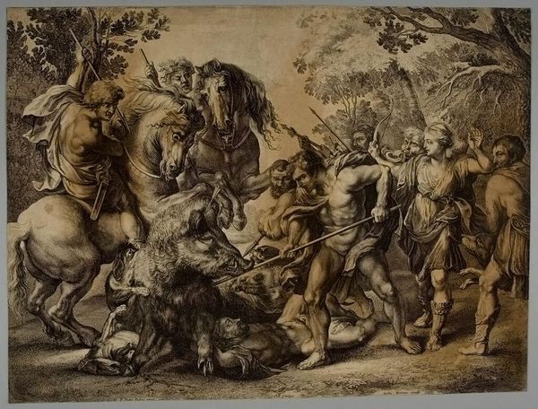 Curator: It's a chaotic scene—dark, dramatic. So many figures intertwined. Editor: Indeed. What we're looking at is Louis Surugue's "Wild Boar Hunt," currently residing at the Harvard Art Museums. Surugue lived from 1686 to 1762, a period where hunting scenes were popular, often reflecting power dynamics. Curator: It definitely feels like a performance of power. The central figure with the bow—is that meant to be a specific person, or more of an allegorical figure? Editor: It's likely a reference to classical mythology, perhaps a Diana figure, given the huntress imagery. The wild boar itself was a symbol of untamed nature, something to be conquered. The composition subtly reinforces a gendered relationship to nature, where male authority prevails. Curator: And what about the dogs? They are also active participants. Editor: Yes, the dogs' participation in this "hunt" emphasizes the human relationship with animals, displaying the control humans have over nature. This engraving acts as both a hunting scene and a broader comment about our role in nature. Curator: Thanks. I now see how this image reinforces dominant power structures and the assumed right to control nature. Editor: Exactly, seeing art in this wider context allows us to explore it more deeply.