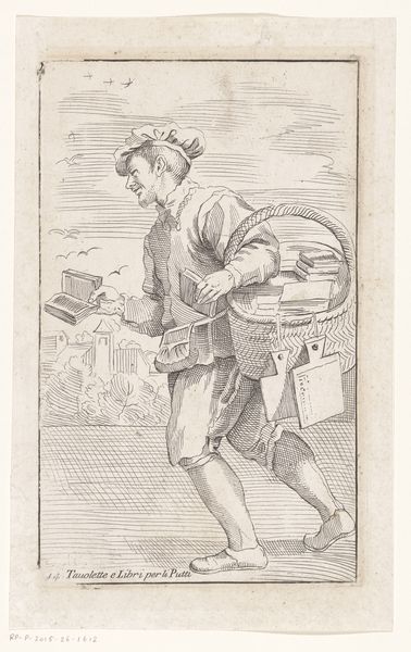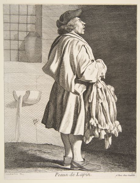 Anne Claude Philippe Caylus created this print titled "Ink Seller" using etching. During the 18th century in France, visual representations of the working class were becoming more common. This image invites us to consider the lived experiences of those who occupied the lower rungs of society. The "Ink Seller" wasn't just providing a commodity; he was a vital part of the flow of information, a key element in the burgeoning culture of literacy and correspondence. What strikes me most is the quiet dignity in the figure’s posture. Despite his humble profession, there's a sense of self-respect and purpose. Caylus captures not just a worker, but a person contributing to the social fabric of his time. The print reminds us that even in the most rigid social hierarchies, individuals find ways to participate, contribute, and leave their mark on the world. Caylus, through this simple yet evocative image, prompts us to reflect on the value and visibility of all members of society.