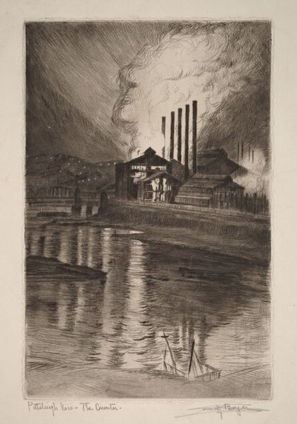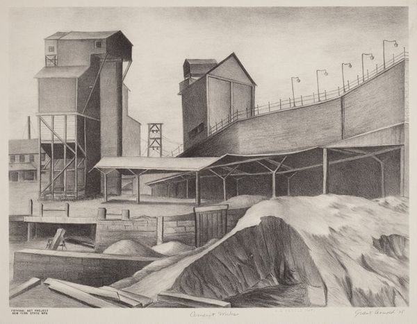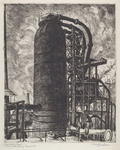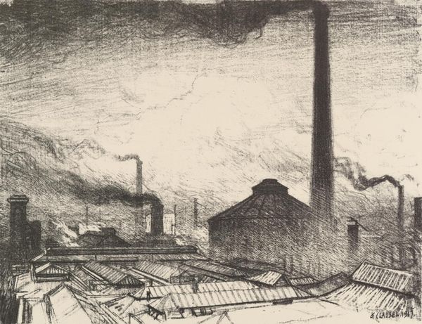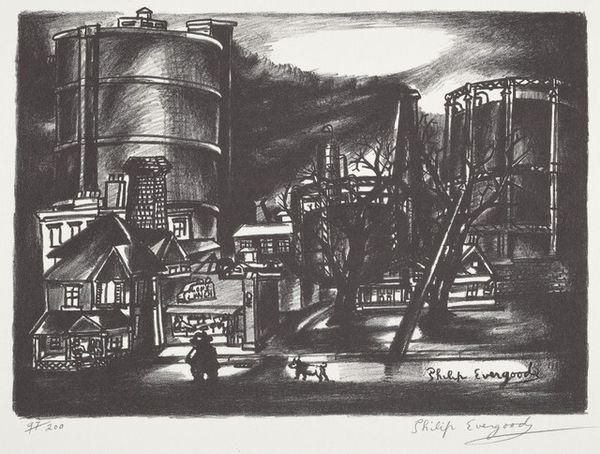 This is a black and white print called 'Gass-Tanks' by Tunis Ponsen. The sombre tones, using what appears to be a lithographic crayon, give the scene an ethereal, almost dreamlike quality, despite depicting an industrial landscape. I’m drawn to the subtle variations in texture here; from the velvety blacks of the tanks to the hazy rendering of the smokestack in the background. The artist creates a sense of depth and atmosphere. Take a moment to observe the road curving into the distance, where the artist depicts two anonymous figures. There is a contrast between the softness of the crayon and the harsh reality of the industrial scene. It reminds me of the work of the German Expressionists, who used printmaking to express feelings about modern life, or perhaps Lyonel Feininger. Like them, Ponsen finds a strange beauty in the industrial world, and captures it with a personal touch. Ultimately, the meaning of the work is left open to interpretation, inviting us to contemplate our relationship with the industrial landscape and its impact on our lives.
