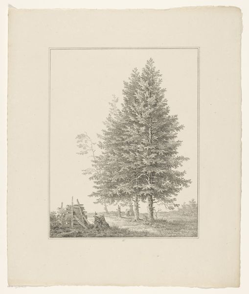 Curator: Before us, we have Max Josef Wagenbauer's "Fir Tree Amongst Three Tree Stumps at a Forest Edge," created around 1823. Editor: It's stark. That central tree really dominates the scene. The details in the foliage are quite intricate. Almost architectural in the way it's rendered. Curator: Yes, Wagenbauer seems quite invested in a very faithful representation of the forest. It reflects a prevailing romantic ideal too, of the power and sublime nature found within such spaces. Editor: I'm drawn to the stumps, actually. The remnants of trees felled; it speaks volumes about human intervention and use of resources, a transformation of raw materials. Do we know how this forest might have been utilized? Curator: It likely would have served as resource for the burgeoning urban centers nearby. Also, these kinds of forest scenes were often depicted in the context of larger political narratives relating to sovereignty. Land ownership and forestry were points of contention during Wagenbauer's time. Editor: That lends a socio-political layer to what seems like a tranquil landscape. The scale, or rather the limitations in scale through his choice of pencil and paper, give a certain intimacy. The hand labor becomes apparent in the minute crosshatching. Curator: Definitely, the realism is compelling. The attention to botanical accuracy fits the rise of scientific naturalism that started during the Enlightenment. Editor: I'm wondering about the choice of drawing; given its portability and the rise in popularity of sketchbooks. The ability to make these types of work for a growing, consuming class must have really opened up avenues for Wagenbauer to engage with different demographics. Curator: I find myself reconsidering the framing of landscape—it isn’t just passive scenery but carries complex cultural and historical meanings, too. Editor: I agree. Focusing on those material choices and their context, allows for a richer understanding. The work allows the viewer to reflect on that interaction between nature, resources and human endeavors.
