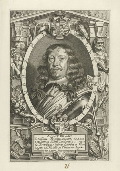 Johann Jakob Metzger created this print of Zacharias Wildegans. The portrait, framed in an oval, invites an immediate focus on the sitter, whose gaze meets ours directly. The composition is carefully arranged to convey status and intellect, while also offering more subtle details for interpretation. The subject is framed by an elaborate border featuring text and heraldic symbols, merging the portrait with symbolic language, reflecting the conventions of Baroque portraiture. Metzger has paid careful attention to textures, using detailed lines to differentiate between the smoothness of skin, the fabric of the clothing, and the soft waves of the hair. This attention to detail not only enhances the visual experience but also adds depth to our understanding of the sitter’s persona. Consider how the artist employs line and form to guide the viewer’s eye. The formal elements, therefore, are not merely decorative but work as a structured system to communicate meaning. The way the portrait is constructed draws attention to what the image is designed to convey, opening questions about identity, power, and representation.