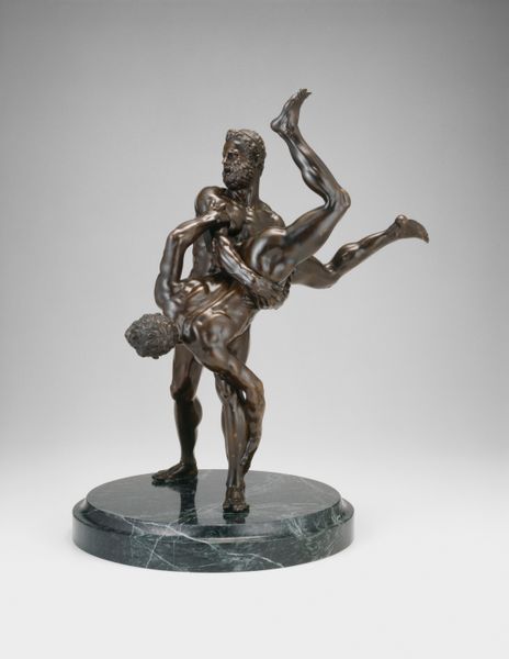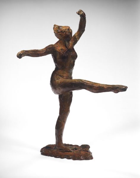 Curator: Here we have Edgar Degas’ sculpture, “Fourth Position Front, on the Left Leg,” created somewhere between 1885 and 1890. Editor: She looks a bit…precarious? All that weight balanced on one leg, those arms so high. It's like she's perpetually on the verge of tipping over, reaching for something just out of grasp. Curator: It's crucial to remember the historical context. Ballerinas were often perceived as working-class women, their bodies a commodity in the art world. Degas often depicted them with a realism that diverged from the romantic ideal. Editor: That makes sense. It’s not like a glamorous, polished monument, is it? There’s a rawness here, a vulnerability even in the pose's supposed strength. It almost feels voyeuristic. Curator: Some interpret this as Degas capturing a candid, backstage moment, demystifying the performance. The physicality, the sheer labor, is palpable. Think of how these dancers’ bodies were often subjected to intense scrutiny and control. Editor: Exactly. And it's not just about what she's doing, but what’s being *done* to her, you know? This constant pressure to achieve an impossible ideal… the objectification is screaming at you! Still, in that frozen position, is also the determination to be perfect for the show, and to find her artistic truth in this form. Curator: Yes. I agree that by foregrounding the dancer’s strenuous effort, and by making that so visible, the artwork subtly undermines the spectacle it represents. This can be seen as a critique of power structures, class, and gender during that era. Editor: I see it, totally! I’ll never see ballerinas in the same way again, thank you for all the background and insights! Curator: And for me, you unlocked a different side to this bronze: an act of human resistance within the ballet establishment.
