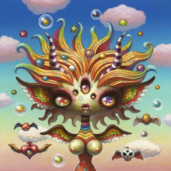Curator: I'd like to draw our attention to "Earth Mother" by Yoko d'Holbachie. This portrait blends surrealist and fantasy elements, realized in acrylic paint. It's quite striking. Editor: Indeed. My first impression is that it evokes a dreamlike state, perhaps a whimsical yet slightly unsettling vision of nature. The creature's symmetrical composition, its vibrant but oddly muted palette—there's a lot to unpack. Curator: I'm immediately thinking about how the artist reimagines the archetypal Mother Earth figure. Look at the almost cartoonish features mixed with organic, root-like structures. D’Holbachie seems to be making a statement about the complexities of the natural world. The being in the portrait exudes both maternal care and ecological fragility, does it not? Editor: I appreciate your perspective on the figure’s roots and their significance, yet I cannot avoid interpreting her composition as ornamental; all of its lines and colors serve to frame its distinct symmetry. The combination of perfect symmetry, vibrant colors, and organic matter certainly emphasizes a feeling of being alive. It is not clear however what kind of “life” is on display. Curator: That brings me to wonder about its overall intention. Could it be a comment on our often contradictory relationship with the Earth—our adoration mixed with exploitation? Her wistful expression combined with these ornate details could represent both beauty and an overburdened responsibility toward nature. It's like a commentary on intersectional ideas, where the well-being of the environment, motherhood, and a plea to action intersect. Editor: I acknowledge that social and political considerations could very well be embedded here, especially if we read this artwork within the trajectory of art addressing our environmental challenges. On its surface, however, the interplay between naturalistic and artificial elements creates a mesmerizing optical phenomenon. Look at the contrasting textures of her “dress” alongside the candy-like spheres atop her head. Each is meticulously rendered. Curator: I see what you mean. These strange structures certainly are worth observing up close and in terms of details. The conversation should consider the artist's possible role and feelings as a caretaker of the world that is to come. These structures can also symbolize an idealized expectation as opposed to natural, realistic details. Overall, however, this portrait serves as a testament to nature's power, fragility, and complexity in today’s world. Editor: Absolutely, a captivating juxtaposition of organic and synthetic elements makes this artwork unique in our understanding of the world around us.