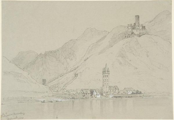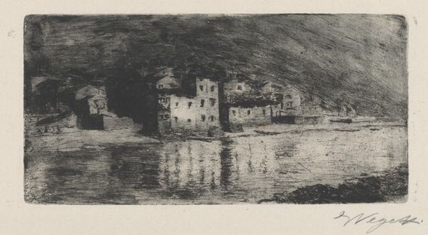 Editor: So, this is "Kasteel aan de Rijn", or "Castle on the Rhine", an etching, possibly from 1886, by Elias Stark. It’s so delicate. The details are incredible, considering it's a print. I'm curious about what strikes you when you look at this piece? Curator: What captures my attention immediately is the image's mirroring quality. Not just in the literal reflection on the water, but the duality of power and vulnerability expressed by the castle. How does that resonate with you, knowing castles served as both defensive structures and symbols of dominion? Editor: I hadn’t thought about the symbolism. It feels more like a romantic landscape to me. Is that naiveté on my part? Curator: Not at all! Landscape as a genre is full of symbols of power. Consider the Rhine itself – a historical boundary, a vital trade route. Stark presents the castle, not just as a building, but a keeper of collective memory. Notice how he contrasts the sharp, defined lines of the castle with the softer, more fluid rendering of the water and sky. What does that visual tension suggest to you? Editor: That maybe the structure’s imposing but ephemeral at the same time, with the soft landscape overshadowing it, I suppose? Curator: Precisely! This artwork invites us to reflect on how permanence and change coexist. The castle might be physically imposing, but its reflection – and, by extension, its cultural weight – is subject to the shifting currents of time. Editor: That’s fascinating. I’ll definitely look at landscapes differently from now on. Thanks for sharing that!