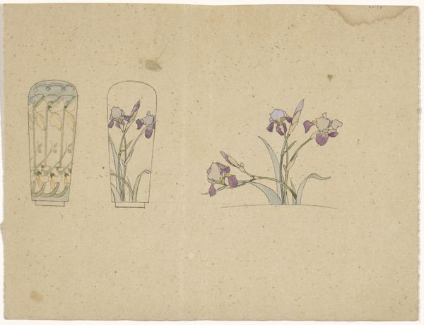 Amédée de Caranza rendered this design for a plate with cyclamens using graphite and watercolor on paper. The choice of watercolor offers a luminosity that perfectly captures the delicate, translucent quality of the cyclamen petals and leaves. But this isn't just a pretty botanical study. The design, meticulously drafted with graphite, suggests a template for mass production, linking it to the industrial processes of the era. The regularity of the floral pattern, contained within a precisely drawn circle, speaks to the era’s fascination with both nature and industrial efficiency. It reflects the dynamics of production and consumption during that time. Consider the labor involved: from the artist drafting the design, to the factory workers potentially reproducing it on ceramic plates. By looking closely at the materials and processes used, we gain insight into the social context of this elegant design. It challenges us to see beyond the surface and understand how art, craft, and industry were intertwined.