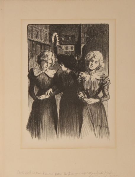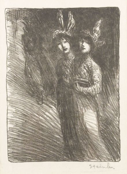 Editor: This is "Veuves d'un Louis," or "Widows of a Louis," a drawing by Théophile Alexandre Steinlen, created in 1915. It seems to be a pencil drawing, maybe with some watercolor accents. It has a somewhat somber mood. There is such stark light and shadow... It's intense. What strikes you most when you look at it? Curator: It sings a quiet song, doesn't it? A delicate symphony in charcoal and muted tones. To me, this image embodies the fragility and resilience of the human spirit. These aren't just "widows"; they are echoes of lives intertwined, navigating a world perpetually veiled in shades of grey. Does the perspective make you think they are cornered, or are they heading somewhere, walking towards the light at the edge? Editor: That's a beautiful way to put it. I see what you mean. I hadn't really considered them moving toward anything, more that they were huddled, but the strong perspective... it gives the whole piece an urgent feeling now. Do you think the stark tonal contrast emphasizes the individual experience of grief or a more shared sisterhood? Curator: Ah, that’s the lingering whisper in the piece. Their faces are blurred and indistinct, a common impressionistic element, and yet they share a visual language, almost a shadow version of the 'groupthink' you might encounter among any chosen family or community... Is there a sense they have lost their own distinct selves within their sorrow, a sacrifice to a collective wound, perhaps, that you can almost physically hear, in the scratching of the pencil? Or are their similar expressions, attire, simply artifacts of their station in society? Editor: That's such a profound observation. I hadn't considered the loss of individual identity within their shared grief. This has been enlightening, making me rethink how art can speak to collective experiences! Curator: Absolutely! It also invites a broader discussion on how society remembers its fallen. Maybe we can ponder next time how public grief impacts not just art, but societal memory too.