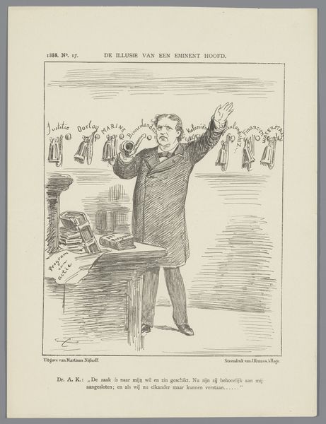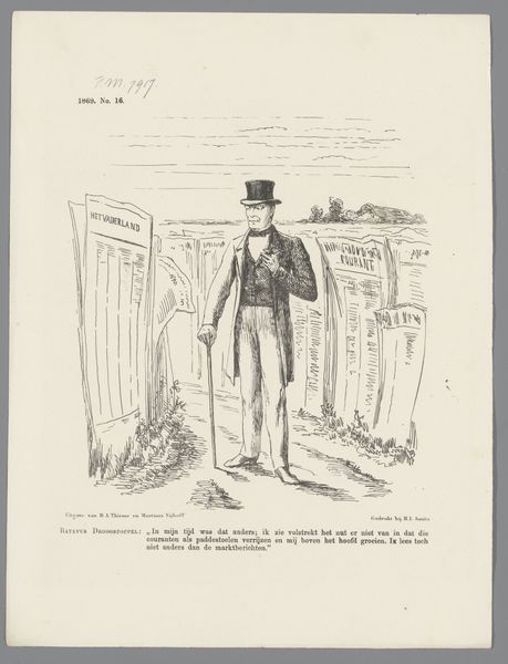 Curator: This drawing by Johan Michaël Schmidt Crans, made with ink and pen in 1877, strikes me immediately with its rather assertive gesture. The sharp lines used for shading suggest both anger and a somewhat frantic energy. Editor: It is a curious image, isn't it? Looking at it through the lens of social history, we see this work, titled "Spotprent," is a caricature—likely commenting on political or social tensions of the time, as reflected in its visual language. Curator: Yes, observe the meticulous detail given to the garments of the two figures. The use of hatching and cross-hatching creates texture and depth, emphasizing the contrast between the figure holding the documents and the one seemingly in service. What meanings can you draw from this contrast? Editor: Well, without specific contextual knowledge, it's hard to decipher the nuances. The "ontwerp-lager onderwijswet"—likely an education proposal—on top of the drawing might point to some debate over educational reform. Note how the documents appear ripped. Curator: Indeed. And see how the artist employed jagged, radiating lines to intensify the focal point and amplify the sense of upheaval. There's a calculated emphasis on distortion to communicate an idea. Editor: And given that caricatures serve as societal mirrors—exaggerating and amplifying—this piece potentially provides insights into power dynamics and contemporary issues. The subtitle "Kutjper Terug uit Nizza" adds further layers of potential narrative... Curator: Considering all aspects of visual structure, the contrasting tonal gradations emphasize this visual narrative—elevating what would be an ordinary genre scene to the level of potent commentary through stark interplay of forms and shapes. Editor: Agreed. Whether for pedagogical or polemical use, its potency hinges on engaging with societal forces. It highlights art's inextricable relationship to society, showcasing how meaning is collectively constituted. Curator: Through examining the artistic elements, the careful deliberation becomes evident—every line contributing to a harmonious synthesis intended to move its intended viewer toward specific recognition and ultimately shared conviction... Editor: So yes, the artwork serves as a complex cultural artifact whose essence and lasting impact necessitate further study of that moment.