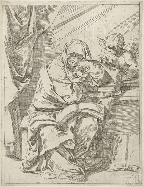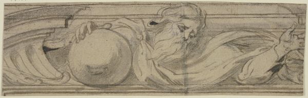 Editor: Nikolaos Gyzis painted "The Archangel, Study for 'The Grounding of Faith'" in 1895 using oil paint. It’s a rather dramatic piece; the dark background and the swirling drapery create a sense of movement. How do you interpret this work focusing on its form and structure? Curator: I find the artist's formal choices quite striking. Consider the limited palette and the broad brushstrokes which almost seem to dematerialize the figure. The contrast between the dark, undefined background and the luminous archangel is structurally compelling. The archangel, with its prominent wings, dominates the pictorial space and leads to a sort of tension within the piece, as we notice its gesture points downwards and is seemingly weighed down by the other figures in the artwork, almost like being forced in a different direction than it wishes to be. How might we decode these stylistic attributes to yield understanding? Editor: The swirling drapery you pointed out definitely adds to the feeling that it is weighed down. So, is it right to analyze that the dynamic lines are meant to show tension between forces within the angel? Curator: Precisely. The composition does not resolve in any classical way; instead, the energy coils inward and remains locked within the frame. Think of how the light catches certain aspects and forms— the wing, the angel’s garments and how the weight and light operate throughout. Consider how the brushwork contributes to this effect as well. Editor: I see now, it really focuses more on how it conveys a certain feeling, which, because of those tensions you noticed, doesn’t exactly end up hopeful! Curator: Indeed! These dynamic brushstrokes and strategic points of interest create visual complexity. Editor: Thank you. I now understand it by seeing it instead of understanding it. Curator: You're most welcome. It has been a pleasure viewing art in this manner.