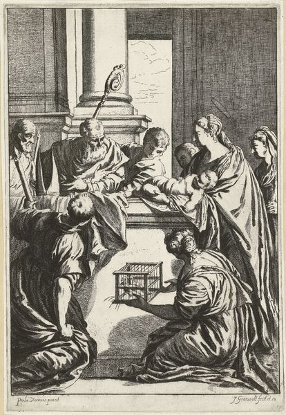 Curator: Here we have Johann Anton Riedel’s "Confession, from 'The Seven Sacraments'", an engraving from 1754, currently residing here at the Metropolitan Museum. Editor: Ah, yes. It’s instantly striking how this monochromatic world seems heavy with unspoken truths. There is such intimacy within this stark print, yet shrouded, wouldn’t you say? Curator: Definitely. Riedel captures such personal intensity through the architecture of the confessional itself, almost framing the sacred exchange happening inside. Consider, though, how confessionals are really theatrical spaces for catharsis. Editor: They are indeed stages! I find the almost formulaic nature interesting; a private ritual, a set piece of dark wood, yet the individual penitent is hopefully liberated by admitting one’s vulnerabilities. But also, observe the priest's raised hand—a very specific gesture indicating absolution, isn’t it? The open palm often indicates giving or receiving. Curator: And think of the penitent holding a rosary! Visually and conceptually they serve as a tangible connection to a higher power during this act of contrition. But consider how the artist utilizes the traditional composition of genre-painting to represent religious custom, highlighting how intertwined they were in Baroque society. It brings me to ponder: does this visual echo intensify our reading of it as sincere and historically informed? Editor: I like your turn of thought! The cross is an anchoring image that, culturally speaking, goes to great lengths toward conveying spiritual ideas in shorthand. It appears that these traditional, accessible cues are what invite people in. Curator: Looking closely now, the lines used to create the textures of robes, wood, even skin – so detailed, really conveying a rich sense of reality through just line work. The light source creates subtle depth. The ability to imply so much detail speaks volumes, particularly when one considers the limitations inherent to the etching process. Editor: Right, to take it back to that "starkness"—I had almost said emptiness—the grayscale coloring lends itself to deeper themes; to contrition, to judgment, and to hope as one hopes for forgiveness. The color story alone adds volumes beyond just simple storytelling. Curator: I agree. Riedel’s composition prompts contemplation on how physical spaces are imbued with ceremonial meanings. Editor: Ultimately, a wonderful look into humanity, the sacred, and our own shadowed selves!
