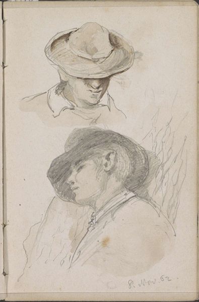 Curator: Let's turn our attention now to "Three Men's Heads with Hats," a pencil drawing made around 1862 by Johannes Tavenraat, housed here at the Rijksmuseum. What's your immediate reaction to this sketch? Editor: Restrained, almost melancholic. It's like a glimpse into a quiet moment of reflection. There's a palpable weariness in those downcast eyes. I am immediately interested in their garments as they seem to have meaning and connection to the person who wore them. Curator: I think the Romanticist influence certainly emphasizes individual emotion, doesn't it? Knowing Tavenraat was working in the wake of the Dutch Golden Age, it’s fascinating to see how he maintains that Realist observation, but applies it to a more introspective subject. These are working men, yes, but lost in thought. Editor: Exactly, and the hats become incredibly important signifiers. Note the materials, probably wool or felt, quite everyday. Were these made at home, perhaps through cottage industries, or mass-produced in developing factories? The very fact that these men, presumably laborers of some kind, needed hats—what does that tell us about their work, their exposure to the elements? This drawing whispers about the economics of the mid-19th century and fashion and labor. Curator: Yes! And the artist captures that so subtly through the rough textures he renders with simple pencil strokes. You almost feel you could reach out and touch the fabric. The materiality grounds it, doesn't it, prevents it from becoming overly sentimental. There’s also the repeated form, the trio itself-- why these three men, and why captured in one drawing? What is their relation? What's the narrative? I want to dive into it further and find out. Editor: The placement also raises questions, and the repeated use of head coverings asks to the conditions of working-class attire in this era. Do the marks from the artist reveal him sitting at his station sketching in person, versus from another scene? I notice the way they each obscure their sight - their agency and future are partially concealed. Curator: It certainly makes you ponder the layers beneath the surface. Something so seemingly simple – a quick study of three men – holds so much complexity. It feels strangely contemporary. Editor: Agreed. The economic structures and the labor which they portray endure and connect to many present-day inequalities of power. Curator: Thank you, your points are illuminating. Perhaps the beauty is not just in what's depicted, but in what the drawing evokes.