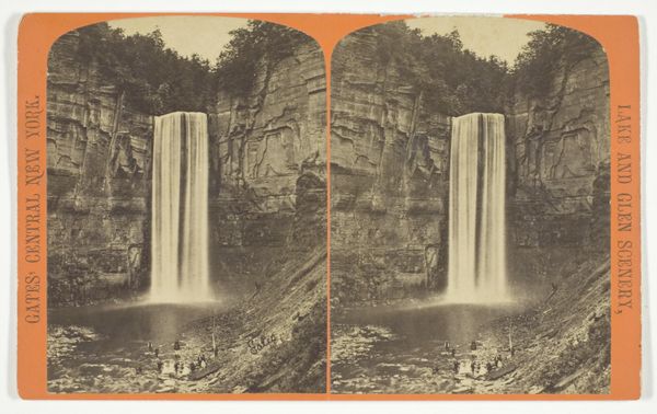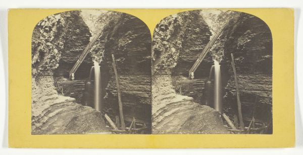Editor: This is "Fall Creek, Ithaca. Cascades above Irish Hammer Fall" by J.C. Burritt, a silver print daguerreotype from the 1860s. There's something incredibly serene and almost otherworldly about this image of the cascading waterfall. What’s your interpretation of it? Curator: This image, made for a stereoscope, speaks volumes about the changing relationship between Americans and their environment in the mid-19th century. The Hudson River School was hugely influential and helped people see wild spaces in an appealing light, creating tourism and a real push for parks. How does that affect the popular perception of our interaction with nature at the time? Editor: So, it's almost a promotional tool for experiencing nature firsthand and, ultimately, owning that experience somehow. It is in stereo after all - supposed to put you right there! Curator: Exactly. This photograph participates in a broader visual culture that romanticized the wilderness, and made accessible by modern technology like the railroad and camera. The image could become a commodity, travel a display of wealth, an adventure brought home. We see it now, mounted for a stereoscope; this was not a document of experience but part of that experience's visual vocabulary. Does this change your view of that sense of serenity that you mentioned before? Editor: It definitely adds a layer of complexity. It is no longer such an innocent image. Learning the historical context changes how I interpret the tranquility, because it reflects societal motivations that go far beyond a simple appreciation of natural beauty. Curator: Right. Understanding that historical positioning highlights how art can both reflect and influence societal values concerning nature and the pursuit of leisure. Editor: Thanks! Now I see it's a bit of a commercial enterprise disguised as art! Curator: My pleasure; it seems that understanding has broadened your perspective of photography from the 19th century.