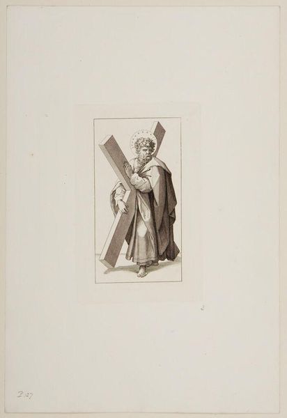 Editor: So, this is Ferdinand Ruscheweyh's "Christ and the Apostles" from the Harvard Art Museums. It's a very formal depiction, but there's something almost serene about the figure. What do you see in this piece? Curator: Serene indeed! It's like a quiet strength emanates from him. I'm drawn to the way Ruscheweyh uses line to create texture, almost like he's weaving a tapestry with his burin. It feels deeply reverent, almost like a whispered prayer. Notice the halo—it's not a solid disc, but a collection of light, sparkling points. Makes you wonder, doesn't it, about the nature of holiness? Editor: It does! It's interesting how something so carefully rendered can still feel so ethereal. Thanks! Curator: My pleasure. Art's always more fun when shared, isn't it?