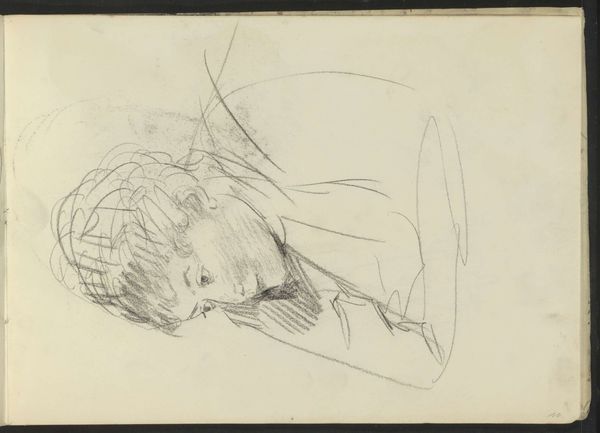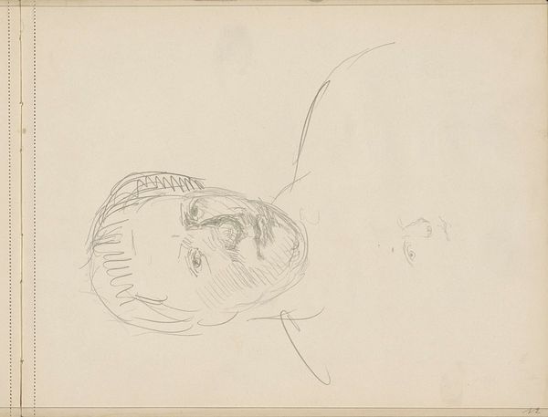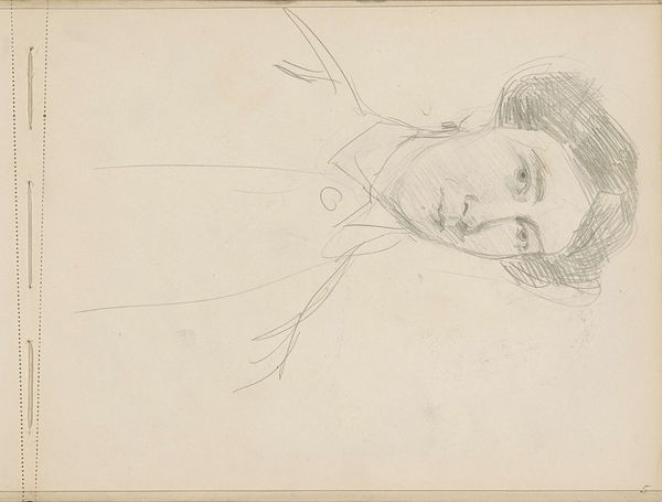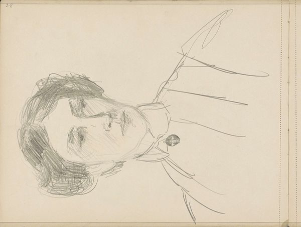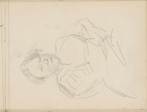 Editor: This is "Portrait of an Unknown Woman, Sitting," a pencil drawing by Isaac Israels, likely created sometime between 1875 and 1934. There's something very immediate about it, like a fleeting impression captured on paper. What compositional elements stand out to you? Curator: Primarily, it's the stark juxtaposition between the economy of line and the subject. Observe the careful articulations around the eyes, contrasted with the almost frenetic scribbles suggesting the form of her body. This deliberate disparity implicates a structural reading – is this a commentary on objectification, rendering the person secondary to the gaze? Editor: Objectification? I hadn't considered that. It seemed more like a quick study, but now that you mention it, the facial expression does seem more detailed than the rest. Is the negative space significant? Curator: Precisely. Note how the subject is positioned asymmetrically, creating a tension with the edges of the support. Further, the stark emptiness surrounding her forces us to focus solely on the lines themselves and their strategic deployment in signifying the sitter. Do you observe how the use of line weight directs our viewing? Editor: Yes, now I see how the heavier lines around the face create a focal point. Before, I just saw it as a sketch, but the way you break it down makes me consider the choices he made and what they might mean. Curator: It is through rigorous deconstruction that we begin to see the aesthetic choices inherent in any work of art. By attending to the arrangement of form and ignoring biographical claims we can analyze an intrinsic artistic truth. Editor: I definitely have a new appreciation for what I initially dismissed as a quick sketch. I'll never look at a drawing the same way! Curator: The layering of intrinsic components over time, through considered thought and critical discussion, will ultimately offer a renewed sense of analytical potential.