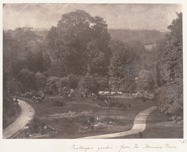 This is Geldolph Adriaan Kessler's photograph, "Het gezelschap bij een wandeling in een stadspark in de Harz," showing people strolling in a park. The image has a sort of dreamy quality, maybe because of the sepia tone, or perhaps because there is such a range of soft greys. What gets me is how the architecture in the background is blurred into the trees. Look at the way the buildings are almost part of the landscape, becoming one with the foliage and sky. It’s this kind of ambiguity that makes you wonder about the relationship between nature and civilization, and how we as humans see ourselves fitting into this picture. You know, this reminds me a little of Corot's landscapes, where things are soft and atmospheric. It's like Kessler’s photograph is just one moment captured in time, suggesting that art is an ongoing conversation across generations.