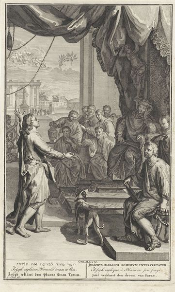 Curator: Adriaen Lommelin produced this engraving, "Onthoofding van Johannes de Doper"—that's "The Beheading of Saint John the Baptist"—sometime between 1630 and 1677. It's currently held at the Rijksmuseum. It clearly places itself within the Baroque style. Editor: Ugh, that's intense! Right off the bat, it gives me a sort of morbid, almost theatrical feeling. All that detail squeezed into such a small space, makes you lean in real close. It feels both distant and right in your face. Is it me or is Baroque about a kind of visual shock value? Curator: The Baroque often does use drama to provoke an emotional response, especially when dealing with religious themes. We're dealing here with not only religion but with narratives around power, gender, and the interpretation of history itself. Salome, as depicted, is often positioned within discourses about female power, particularly the power a woman holds within patriarchy, her influence over men. The dance, the request, it becomes this point of intersection for politics and gendered violence. Editor: Salome seems detached in the artwork. Almost like she's holding a serving dish. Like, "Here's your head, sir, enjoy." It’s creepy how everyone but John seems kind of unmoved by this brutal act. What's wild is how that guy holding the sword is kinda standing on John's body. Curator: Absolutely, the physical dominance depicted amplifies the narrative. Note the religious structure barely visible in the background – the engraving implicates religious structures as almost passively witnessing, or even sanctioning, the act of violence, a frequent critique within postcolonial and feminist biblical criticism. Editor: The inscription along the bottom is, if my archaic Dutch is correct, about this holy head ending up as a dancing fee for a light woman in Mechelen? Seriously twisted party favor, if you ask me. There's an energy that sort of glamorizes this too; its pretty dark. Curator: Early modern prints circulated imagery widely. Therefore, prints like these also become incredibly powerful forms of commentary that work in the context of religious wars, shifting political powers, etc. I always find myself reflecting on why certain stories and images get repeated so often and across so many cultures. Editor: Seeing that contrast, all those narratives at play, is definitely making me rethink this piece. Still deeply disturbing, but with layers upon layers. Curator: And ultimately a stark representation, wouldn't you agree, of power structures then and now?