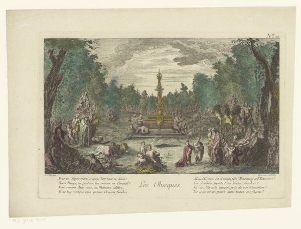 Pieter Schenk created this print of the Adelaarfontein in the garden of Villa d'Este in Tivoli. The balanced composition divides the scene horizontally into distinct layers: sky, trees, and garden. This layered effect creates a sense of depth, drawing the viewer's eye from the foreground to the distant horizon. The Villa d’Este gardens, known for their elaborate fountains, exemplify a fascination with transforming nature into art. Here Schenk has captured the interplay between organic forms and structured design. Notice the symmetrical arrangement of the garden's pathways and the formal placement of plants, which contrasts with the more naturalistic depiction of the trees and sky. Schenk employs linear perspective to enhance the illusion of depth and order. The orderly arrangement of garden elements reflects the values of rationality and control characteristic of the period, where the garden becomes a stage for social display and intellectual engagement.