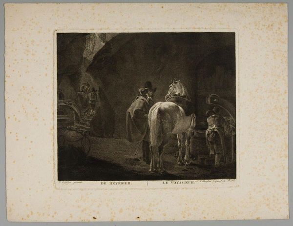 Lambertus Antonius Claessens created this print of a traveler and horse outside an inn using etching and engraving, techniques crucial for disseminating images in the 18th and 19th centuries. The tonal range achieved, from the deep shadows of the inn to the highlights on the horse, speaks to Claessens’ skill in manipulating the metal plate. Lines are incised, then bitten with acid to hold ink, which is then transferred to paper under great pressure. Etching allowed for relatively quick distribution, but was dependent on the skilled labor of the artist and printer. Prints like these, sold relatively cheaply, brought art to a broader public, and depict scenes of everyday life. However, they also subtly reinforced class distinctions. The well-dressed traveler, contrasted with the laboring figures in the background, underscores the social hierarchy of the time. By considering the materials and processes involved, we gain insight not only into Claessens' artistic skill, but also into the social and economic context in which this image was produced and consumed.