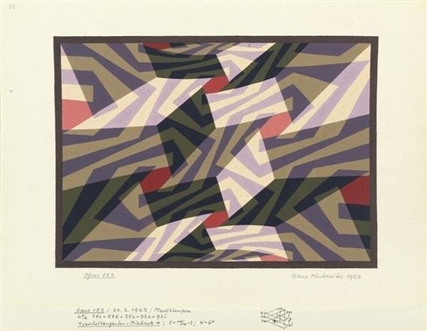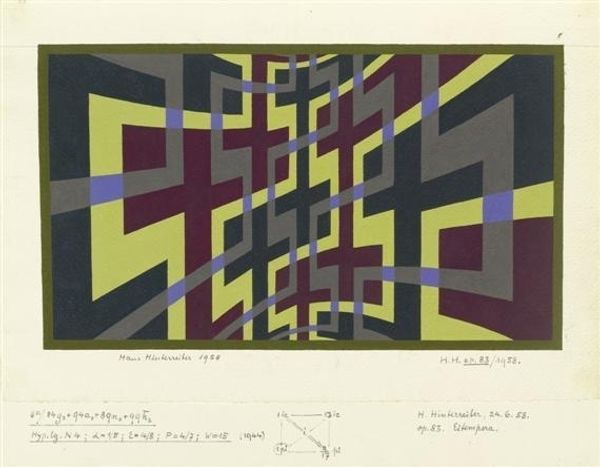 Curator: Here we have Hans Hinterreiter’s “ME 375,” created in 1940. Editor: My initial reaction? Organized chaos. Like a puzzle thrown into the air that somehow manages to hold its form. The muted colors really intrigue me. Curator: The controlled palette certainly makes the composition feel very purposeful. Hinterreiter was part of the Concrete Art movement, after all, which valued rational, mathematical principles in art. Editor: I see that! The geometric forms, the repetition... it’s almost like looking at an algorithm made visible. Do you think the 'ME 375' is a reflection on technology or perhaps something related to the war happening at the time? Curator: Possibly, though interpreting Concrete Art through specific narratives can be tricky. Artists often aimed to create self-referential works, focused purely on form and color relationships rather than symbolic representation. However, the sharp, almost aggressive angles might betray some underlying tension. Also the writings visible underneath the piece are very intriguing. Editor: It does look like he's sketching out formulas almost, doesn’t it? Makes me think about how artists wrestle with order. Like a craving to organize the world to fight off total loss of control. I keep looking for hidden images in here. Curator: And that’s where the magic lies. Despite the mathematical rigor, there’s an openness to interpretation, and invitation for the viewer to find their own rhythm within the composition. Even I, trained in the traditions and contexts surrounding art, find that impulse to let myself get swept into pattern irresistible here. Editor: Exactly! Maybe that's the true nature of pattern after all...a reflection on trying to seek order in a confusing world, even for a moment. Curator: Well, "ME 375" has given me a whole new way of thinking about how order can have a role in art. Editor: For me, it highlights that tension between design and chaos; between logic and how our eyes are always seeking images. It’s an ongoing conversation within a single piece.