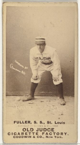 Curator: Let's discuss this fascinating piece of baseball history: "William E. 'Will' Fuller, Catcher, Milwaukee," from the Old Judge series, dating back to 1888. It's a photographic print issued by Goodwin & Company. Editor: My initial feeling? It's incredibly immediate, stark even. He's right there, staring back at us with such a focused intensity. The sepia tones really amplify the sense of bygone days and grainy reality. Curator: Indeed. This card appears within a complex cultural context, remember that early baseball was imbricated in the burgeoning consumer culture of the late 19th century. It acted as a platform for identity formation amid rapid urbanization and industrial change, also these tobacco cards were overwhelmingly targeted towards white men. Editor: Yes, the tobacco card itself acts as a potent symbol. In a way, Fuller becomes both an individual athlete and a representative of the masculine ideal of the period. Baseball represented, for a time, the promise of upward mobility. Looking at the man’s garb, though… the image speaks to vulnerability too. It humanizes the "heroic" athlete and complicates notions of glamour with its display of early catcher's protective equipment, conveying grit, endurance, and an emergent professional ethos, even labor rights. Curator: I see that, it prompts questions of commodification and representation in sport. We might also explore its visual rhetoric, and how it helped to solidify archetypes surrounding race, masculinity, and labor within this period, or how baseball has long served as an entry point into mainstream culture for immigrant populations. Editor: Precisely. But it's also interesting how symbols work through the individual. To me, his upright pose, contrasted with those almost vulnerable eyes creates a complex dynamic that suggests so much. Even if just a single expression and posture. It captures both hope, as well as the social and economic tension inherent at this time in sports history. Curator: Reflecting on it, I'm left considering how an unassuming photograph, seemingly about sport, can unveil societal complexities from race and class to commercialisation of identity during a transformative era. Editor: And I keep going back to Fuller’s eyes. What an amazing, condensed testament to a pivotal moment in American culture, all within that simple baseball card.