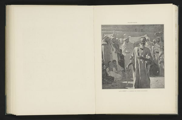 Editor: Here we have Étienne Neurdein's photograph, "Groep caïds met een spel en thee," taken sometime between 1880 and 1890. It's an albumen print that presents a seemingly casual gathering, but I find the staging to be quite deliberate. What do you see in this piece? Curator: Absolutely, you've picked up on something key there. Neurdein was a prominent figure in shaping European perceptions of North Africa. The "casualness" is a carefully constructed image feeding into Orientalist fantasies of an exotic and timeless 'other'. It presents a staged, ethnographic portrayal. The albumen print, with its warm sepia tones, romanticizes the scene, doesn’t it? Editor: Yes, it does. So it's not really showing us a true depiction of life at the time? Curator: It’s crucial to remember that photography in this era was rarely objective. Consider who is behind the camera and their intentions. How might the power dynamics between the photographer and the photographed subjects have influenced the final image? Notice the arrangement, the almost theatrical way these figures are posed, and think about who this image was *for*. It reinforces stereotypical views rather than offering an authentic representation. Editor: So it is really a constructed narrative, one that catered to Western audiences rather than reflecting reality. This piece almost freezes people within someone else’s imagination of them. It definitely provides another layer to consider how we look at history through art. Thank you! Curator: Precisely! Thinking critically about whose stories are told, and *how*, is essential for challenging those historical power imbalances and broadening our understanding of both art and the world.