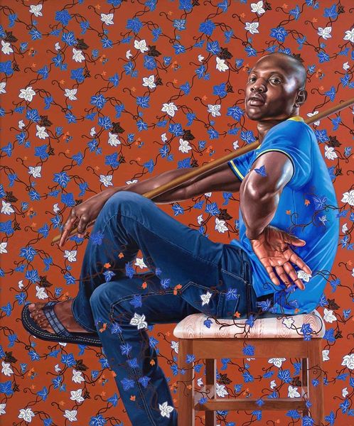 Editor: Here we have Kehinde Wiley's "François Bertin," created in 2012, using oil paint. The subject is striking against that vibrant, patterned background, it’s very eye-catching. What initially stands out to you in terms of form and composition? Curator: The relationship between the figure and the background commands attention. Notice how Wiley uses the flatness of the background pattern to push the figure forward, almost creating a collage effect. The intricate, swirling pattern, typical of African wax prints, is deliberately juxtaposed with the classical portrait style. How does this interplay strike you? Editor: It’s interesting. The realism of the figure against such a bold, almost abstract background creates a visual tension. The figure’s pose, too, feels both contemporary and like a classical portrait, but what is Wiley saying with that? Curator: Precisely. Consider the surface quality of the oil paint itself. The smooth, almost photographic realism of the figure contrasts sharply with the graphic nature of the background. This tension elevates the work. It makes us contemplate how such juxtaposition affects our perception. What emotions or meanings arise from this combination of visual elements? Editor: I think it might challenge our ideas about power, race and representation. Curator: Indeed, and notice that the subject isn’t the artist or from royal descent like many historic classical paintings, but likely just a person Wiley met. Through meticulous formal choices—composition, color, contrast, and technique—Wiley elevates and recontextualizes, prompting critical engagement. Does observing these aesthetic decisions refine your view of the portrait? Editor: Absolutely, recognizing the contrast between the flatness of the pattern and the realism of the figure adds a whole new layer of meaning for me, thank you! Curator: It highlights how formal analysis unlocks more than meets the eye.