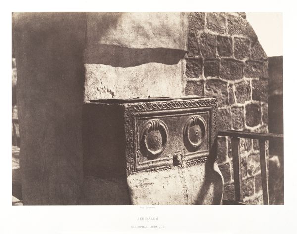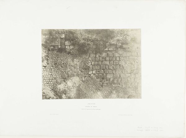 Curator: What strikes me immediately is the density, the sheer materiality of this wall. The weight of those stones... it feels almost oppressive. Editor: Well, that's quite apt. What you are seeing is a photographic print by Auguste Salzmann, titled "Jerusalem, Enceinte du Temple, Détails de l'appareil de la piscine probatique," created between 1854 and 1859. It depicts a section of the Temple Mount in Jerusalem. Curator: Ah, so that's Jerusalem. Thinking about the stones themselves—where they were quarried, the labor involved in shaping them, the way they’ve been laid and held together…It’s a monument not just to religious history, but also to human effort. I am also drawn to what seems like damage done through erosion. What type of printing technique was employed? Editor: Salzmann used the waxed paper negative process, which gives the print its unique, somewhat soft focus and tonal range. It's crucial to remember that photography at this time was viewed as objective documentation, particularly of culturally and historically significant sites. Curator: "Objective" is doing a lot of work there, though, isn’t it? Whose gaze are we seeing? Salzmann's presence, his choice of this specific angle... it's all part of shaping the narrative. It makes me wonder what else he chose to include or exclude. It becomes part of a European project to interpret and display the Holy Land to audiences back home, framing narratives for how viewers are meant to consider a site fraught with complex historical and sociopolitical concerns. Editor: Indeed. There was immense political context driving the selection and viewing of this place. The mid-19th century was a period of increasing European engagement with the Middle East, both politically and culturally. Photographs like these fueled Orientalist fantasies. Curator: And also informed and shaped geopolitical realities, and even power dynamics, if you think about it. The circulation of images played a crucial role in Western understandings of the East. By circulating these pictures widely, there's this implication of European knowledge, of somehow mastering the terrain of the holy city. How very... heavy. Editor: It is a sobering reflection on the complicated interplay of art, politics, and history, when you consider not just the photograph as an image, but as a product of its time, embedded in its power structures. Curator: Exactly, and the physical endurance and long history encoded into those stone structures continue to speak even today. Editor: An enduring, weighty legacy, indeed.