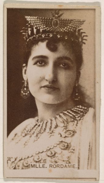 Editor: So, here we have "Mlle. Rordame" from the Actors and Actresses series, printed between 1890 and 1895 by Duke Sons & Co. It’s a photograph, drawing, and print all rolled into one – a cigarette card, meant for mass consumption. It feels surprisingly formal for what it is… what are your thoughts? Curator: Mass consumption, eh? That phrase takes me back! It’s amazing how a fleeting image meant to sell smokes can become a window into a bygone era. I find her gaze so direct, almost defiant, wouldn’t you say? Like she's challenging us across time, “Go on, judge me based on this little rectangle.” What do you make of the theatrical crown and that heavily ornamented costume? Do you get a sense of the specific role she might have been playing? Editor: Hmmm...I see what you mean about her challenging gaze, a bit piercing maybe. I guess I hadn't thought about a specific role for the crown... it just seems a general symbol of stardom. Did these cigarette cards try to be accurate depictions of specific characters, or were they just a kind of aspirational image? Curator: That's the golden question! Sometimes, the details are surprisingly accurate, other times...artistic license, for sure. And of course, the idea was to attach some of her glamour to the product. Smoke our cigarettes, achieve some approximation of fame! But beyond that blatant pitch, it gives me pause... think of all the forgotten faces from the theatre! The images are their legacy, however tangential, a moment preserved. Doesn’t that tug at you? Editor: Absolutely, there is a melancholic beauty there – in a strange way, being on a cigarette card gave her a kind of immortality. It's strange to consider fame's different pathways. Curator: Exactly. Something seemingly frivolous becomes profound. These ephemeral images whisper untold stories, hinting at dreams pursued and sometimes realized... Makes you wonder about the unseen narratives flickering behind our own ubiquitous screens, no?