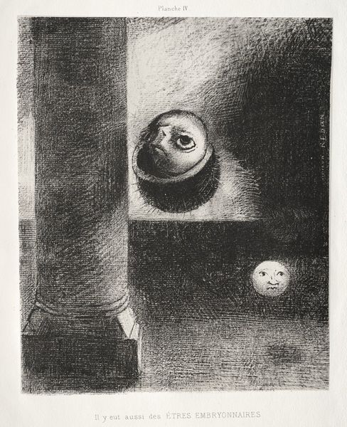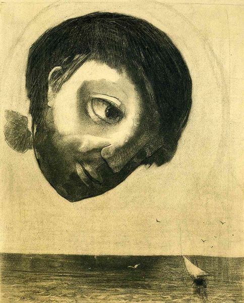 This is Odilon Redon’s "The Marsh Flower, a Sad Human Head," a lithograph. Predominantly monochromatic, it depicts a peculiar hybrid: a human head emerging from a flower. The composition is striking, it’s dark, moody, and evokes a sense of unease. Redon's piece pushes us to consider the boundaries between the human, the vegetal, and the surreal. The flower's stem rises from what appears to be water, suggesting a liminal space, somewhere between solid ground and the intangible. Three orbs float ethereally nearby, disrupting any sense of naturalism. The sad human head, framed by the flower, directs our gaze. Redon blurs the boundaries of our perception, confronting us with questions about identity, existence, and the very nature of representation. This merging of forms challenges fixed categories, prompting us to explore the spaces between the real and the imagined. What truths, or perhaps anxieties, might be found in these in-between places?
