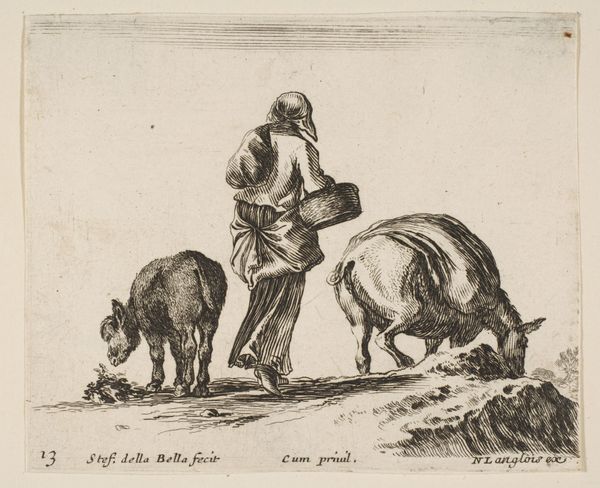 Curator: Let's take a look at Stefano della Bella's print, “Plate 16: an elephant in center, his mahout standing to the right wearing an Oriental costume, another elephant to left in background, from 'Diversi capricci'”. It dates roughly between 1639 and 1649, a fascinating period in European printmaking. Editor: The sheer scale of that elephant in the foreground is striking! And the cross-hatching gives the skin such a palpable texture. It feels heavy, almost melancholic, despite the rather whimsical title of the series. Curator: Indeed. Della Bella was working within the Baroque style, but here, he seems to be toying with Orientalist themes, likely fueled by increased trade and diplomatic missions to the East. Prints like this circulated widely and shaped European perceptions of the “Orient.” Editor: The elephant itself carries enormous symbolic weight, doesn’t it? Think of its association with royalty, wisdom, and even divinity across various cultures. Its presence dwarfs the mahout, which suggests a meditation on power, control, and the exotic “other.” The slightly slouched figure of the trainer almost humanizes him, even as his “Oriental” costume further others him to the viewer. Curator: The ‘capricci’ or ‘fancies’ of the title allows Della Bella some freedom. This isn’t meant as documentary. He's constructing an image informed by both observation, probably from seeing exotic animals brought to European menageries, and from broader cultural assumptions about the East. And how that imagery relates to power and control in the period in which this work was circulating. Editor: Note also how the lines create a kind of visual hierarchy. Our eye is first drawn to the massive elephant, then down to the relatively diminutive figure of his keeper, leading us finally to the more mysterious, diminutive animal far behind them. A visual pathway carefully leading to that notion of perceived power relations? Curator: I find the seeming contrast intriguing between the animal as symbol of the orient against how, as it walks within the frame, that it speaks also about Europe and of Western exoticism in those times. Editor: Yes, Della Bella gives us more than just a depiction. The elephant is a conduit to exploring wider, often conflicted, themes. Curator: It leaves you to ponder, even today, the relationship between observer and observed. Editor: And the lasting echoes of such representations.
