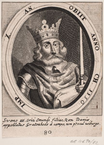Editor: So, this is "Erik Emune," an engraving from 1646. I'm immediately struck by the way he’s holding that sword, almost like a prop. What do you see in this piece? Curator: I see a highly politicized representation of power. This print, created long after Erik Emune's death, attempts to solidify a particular narrative. Who was this king and how was he remembered? What were the pressing political concerns in 1646 when this was made? It's crucial to examine the historical context surrounding the production of this portrait. Editor: You mean it might be more about the 17th century than the 12th? Curator: Precisely! Consider the symbolic weight of the sword – is it an assertion of authority, a reminder of battles fought, or perhaps a commentary on the perceived need for strong leadership in the 17th century? This print is making a specific argument. Who might have commissioned it, and why? It prompts us to question the relationship between historical figures and the agendas of those who depict them later on. Editor: That makes me wonder, what's with the inscription below? Something about his brother? Curator: Yes! Reading these Latin inscriptions provide valuable details and context and hints as to the intended audience and historical events referenced in this print. Editor: So it's like peeling back layers of interpretation to understand the full picture. Curator: Exactly. We have to analyze the artistic choices alongside historical and social power dynamics that were happening at the time this portrait was produced. Editor: I see, that contextual approach is fascinating and really impactful. Thanks for showing me how much more there is to a portrait like this!