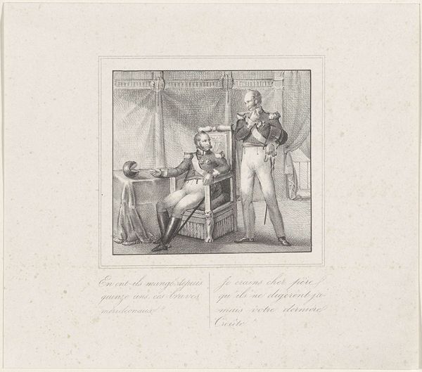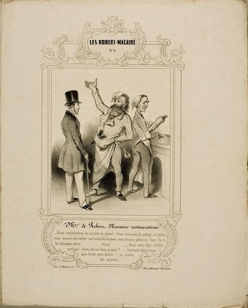 Curator: This is an interesting lithograph by Honoré Daumier, titled "Robert Macaire Accused," which resides here at the Harvard Art Museums. Editor: The mood is quite tense, yet I find the accused’s stance almost comical. He looks more like he is about to break out in song, not await his sentence. Curator: Daumier, a master of satire, uses Macaire, a recurring character, to critique the bourgeoisie and the justice system of his time. It's a pointed commentary on class and power. Editor: Exactly, there’s a very pronounced power dynamic at play. His exaggerated gestures speak volumes about the performative nature of justice and the plight of the accused within that social structure. Curator: It certainly offers us a glimpse into the social and political landscape of 19th-century France through Daumier’s critical lens. Editor: Absolutely. Considering its enduring relevance, it really encourages us to confront similar issues of inequality and injustice today.