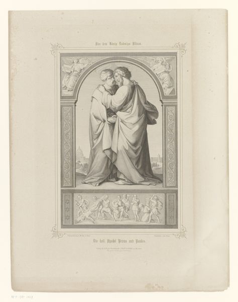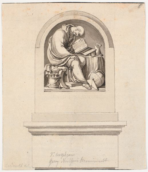 Editor: This engraving, "Grafstèle van Alessandro de Souza Holstein," created by Angelo Campanella in 1809, presents a scene of profound grief. A woman in classical drapery is weeping beside what appears to be a bust of a man. What do you see in this piece? Curator: This work resonates deeply with the visual language of mourning and memory so prevalent in the Neoclassical era. The figure of the weeping woman is clearly an allegory, a personification of Grief itself, performing sorrow. Notice the stylized drapery: those lines, those folds, tell a story. Editor: So the style is a way to evoke the desired emotional response? Curator: Precisely. Consider the laurel wreath crowning the niche above: it’s a classical symbol of victory and honor, suggesting the deceased held a respected position. But it’s not simply a celebration. Wreaths are potent reminders of the cyclical nature of life and death. Is there anything particularly striking to you about the allegorical figure, beyond her sorrow? Editor: She seems…resigned. Peaceful almost. Not thrashing in anguish. Curator: Exactly. Her stillness represents idealized grief, controlled and dignified, echoing values cherished during that era. See how even sorrow itself becomes a form of visual rhetoric, echoing values from Roman and even earlier Greek art. But consider, too, that her pose has been adopted in our own culture: do you not think the modern funerary statue uses this language even today? Editor: Absolutely! It is fascinating how consistent those symbols are across centuries! I didn't really think of grief having its own symbolic code. Curator: The persistence of these visual motifs across time speaks volumes about the enduring human need to give form and meaning to loss, wouldn’t you agree? Perhaps that engraved allegory serves its function even for us now.