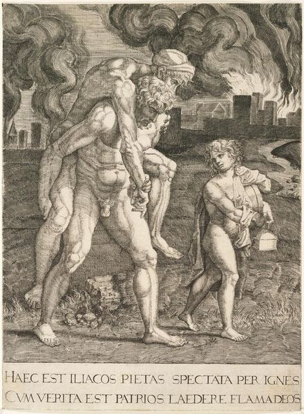 Editor: This is "Aeneas Saving Anchises", an engraving by an anonymous artist. It's packed with figures, and the cross-hatching creates a dramatic sense of light and shadow. What strikes you about the formal qualities of this work? Curator: The tension created by the artist's use of chiaroscuro certainly commands attention. Note how the figures are rendered in stark contrast to the burning city. Semiotically, this darkness represents chaos. Consider, too, the musculature of Aeneas; it's almost sculptural, lending him a heroic presence. Editor: So, the dramatic lighting and idealized bodies emphasize the heroic nature of the scene? Curator: Precisely. And the composition, a pyramidal arrangement of bodies, reinforces a sense of stability and resolve amidst the destruction. The artist invites us to contemplate the relationship between form and meaning. Editor: I see how the formal elements really drive home the story's message. Thanks for highlighting that! Curator: My pleasure. It's in analyzing these components that we discover what the image communicates.