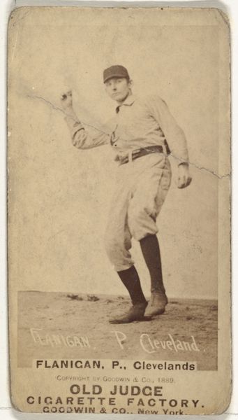This photographic print of Caruthers, a pitcher for Brooklyn, was made around 1888 by Goodwin & Company. It's a thin paper card, originally inserted in packs of Old Judge Cigarettes. The sepia tones come from the photographic process, popular at the time and allowing for mass reproduction. The image is crisp, showing the pitcher's stance, uniform, and even the texture of the baseball. Note the blurring in the background and at the bottom, suggesting a rudimentary studio setting. Goodwin & Company weren't necessarily interested in high art, but in mass appeal. These cards were essentially advertisements, using the popularity of baseball to sell cigarettes. Think about the labor involved: growing and curing the tobacco, manufacturing the cigarettes, printing the cards. The value of the card came not from artistic labor, but its potential for exchange, as a collectible and a commodity. This points to the complicated relationship between art, industry, and everyday life in the late 19th century, challenging our notions of value and artistic intention.