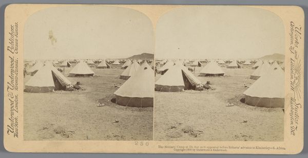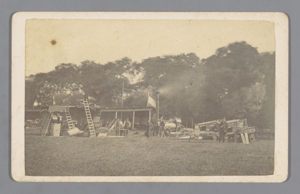 Curator: My first impression of this image is how subdued the entire scene looks; the limited colour palette adds to the feeling of stillness and quiet anticipation. Editor: Let's delve deeper. The Rijksmuseum holds this photograph, titled "Overstroming in Nieuwkuijk," taken by Albert Greiner between 1880 and 1881. It presents an important opportunity to examine the intersection of environmental disaster and social resilience in late 19th-century Netherlands. Curator: Immediately, my eye is drawn to the presence of the tents and the huddled figures; I'm compelled to consider how these motifs reflect broader human responses to displacement and hardship, maybe some feeling of community in disaster. Editor: The tents, sharply contrasting against the landscape, symbolize temporary shelter and survival but could be perceived as stark visual reminders of governmental indifference. Thinking of social contexts of the period, one wonders if the residents could feel powerless to face these environmental disasters without proper assistance from the local rulers? Curator: Visually, this resonates powerfully. The relatively light colour may carry the cultural connotations of hope or of the necessity to keep spirits up. What is most symbolic here? Editor: For me, the monochromatic palette carries emotional weight – a sort of cultural memory surrounding natural disasters and potential social isolation, that leaves the observer an uncomfortable impression. Curator: It’s fascinating how different historical lenses affect our view, how art becomes evidence. Thanks for helping unpack this photo's layers. Editor: And for offering perspectives on emotional resonance and the power of the human will to prevail!