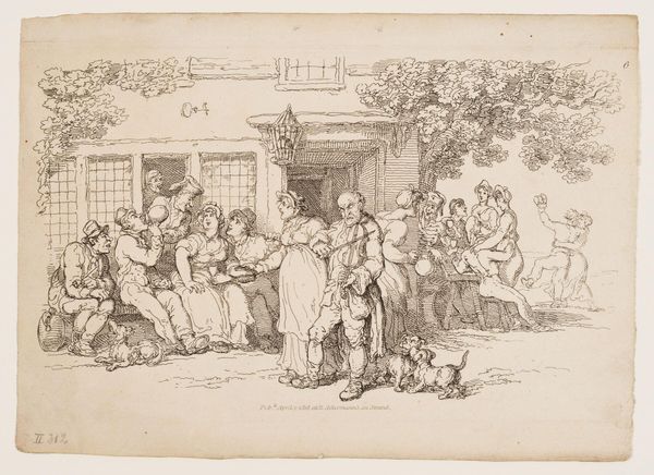 Curator: Adolphe Alexandre Dillens' "Menigte vrouwen voor een herberg met drinkers," created in 1861, captures a bustling scene outside a tavern. This etching and print offers a fascinating glimpse into everyday life. Editor: Oh, the immediate feeling I get is… tension! There’s such a clear divide—the shadowy figures crammed into the tavern doorway versus the assembled women, almost defiant, outside. Curator: Precisely! Dillens masterfully plays with light and shadow, highlighting that contrast you noticed. Beyond the purely aesthetic, it is important to know the socio-political role the imagery like this serves. We are looking at what the role of gender and class distinctions would be and what public narratives Dillens presents for his audiences to grapple with. Editor: Yes, that gendered tension! The women seem ready to… well, confront. Some have these almost medieval looking implements like spears! It’s not a passive gathering. There’s definitely a sense of something about to erupt, though what remains gloriously unclear. Are they protesting? Are they simply staking their claim? It’s like a moment caught just before the storm. Curator: Dillens was definitely tapping into the rising social consciousness of his time, especially regarding women's roles. Notice how he gives each woman a unique face, a distinct character. These aren't just anonymous figures in a crowd; they're individuals. But their resistance still begs questions, such as, "Were they challenging patriarchal structures?" Editor: Their garb gives that era, yet the anger is so timeless. It reminds me of how art always, subtly or not, enters into a silent conversation with the period, right? Curator: Exactly, the dialogue is constant and often challenges our present perspectives! These realistic drawings do so even more poignantly. In art institutions such as this, we often analyze if these were simply works that presented some glimpse into everyday life or a reflection that actually catalyses the period. Editor: It's intriguing how a simple etching, with its monochromatic palette, can hold so much emotional complexity. You are absolutely right—these women are both of their time and eternally relevant. It reminds me we often need to be asking questions as to whose voice art echoes and amplifies, which you mentioned just a bit earlier. Curator: I find myself wondering, even centuries on, whether Dillens intended to provoke questions, not necessarily provide answers. Art can do both.