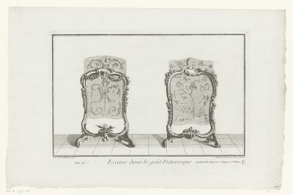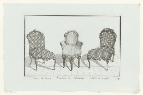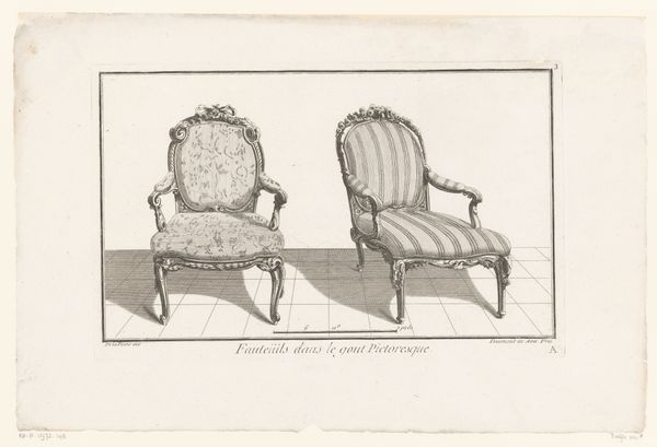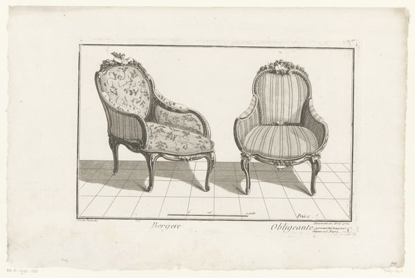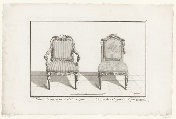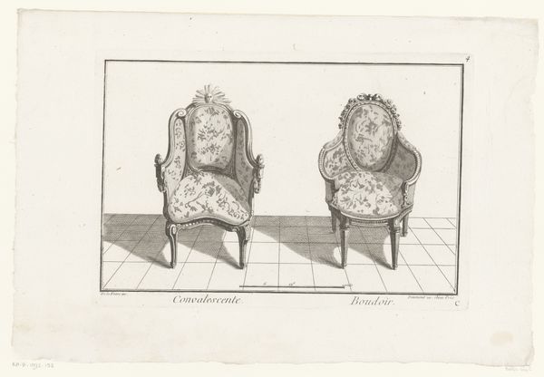 Editor: Here we have an engraving from between 1745 and 1775, currently held at the Rijksmuseum. It's called "Toilet en stoel" - Toilet and Chair – and is attributed to an anonymous artist. It seems so simple, just depictions of furniture, but there is something very precise in this representation. What strikes you most about this engraving? Curator: Well, first off, notice the chairs themselves. One is labeled "Denuë Baignoire," likely intended for disrobing after a bath, and the other "Italienne," or Italian style. Look at how these terms carry cultural weight – bath time becoming a ritual and national identity being projected onto something as everyday as furniture. Editor: So, they aren’t just showing chairs, but representing ideas through them? Curator: Precisely! It’s an era of elaborate social rituals. Think about the symbolism imbued in courtly dress, the minuet, or even landscape paintings designed to reflect the patron's cultivated taste. Aren't these chairs, in their own way, miniature stages for social performance? Editor: I see that now. The decoration and style… They speak of a certain status. So, what does it tell us that the artist chose to depict these particular chairs? Curator: Perhaps a fascination with the accoutrements of the wealthy or, perhaps, a commentary on fleeting trends. Think of how we read meaning into the design of modern technology, reflecting status, aspiration, and even social anxieties. This artist, whether consciously or not, participated in that same tradition. What new understanding do you draw from these thoughts? Editor: I’m left thinking about how objects can become symbols, carrying meanings beyond their practical purpose. And how these meanings evolve and shift over time, reflecting a culture's changing values and priorities. Thanks, that’s given me a lot to think about!