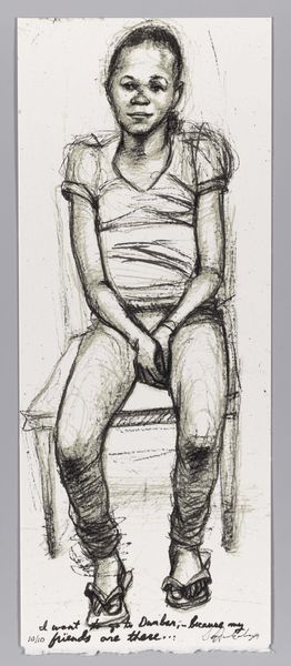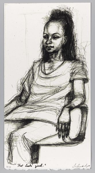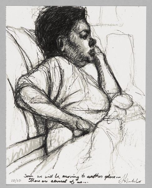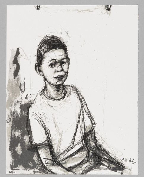 Curator: Sedrick Huckaby's "99% NO. 56 Cobby" presents us with a compelling portrait of a young boy, rendered with immediacy in what appears to be graphite. Editor: It strikes me with its vulnerability. The sketchy lines almost feel like a protective shell around the subject, guarding a quiet interiority. Curator: Huckaby's work often engages with themes of identity and community. Considering the title, do you see a potential comment on social perceptions or limitations imposed on young Black men? Editor: Absolutely. The image resonates with the symbolism of confinement. The figure is seemingly trapped within both the lines of the drawing, and the suggestive weight of the implied 99%. Curator: It's interesting how the artist uses the medium. The seeming incompleteness also suggests potential, an unwritten future still to be defined by Cobby himself. Editor: The deliberate use of incomplete lines as both constraint and possibility is indeed powerful. What does this visual language suggest about the weight of expectation? Curator: It highlights the ongoing struggle for self-definition within societal constraints. Perhaps this is a challenge for us to recognize and dismantle the limitations society places on Black youth. Editor: A somber thought, but essential to considering the work's deeper implications, and how it reflects our shared reality.