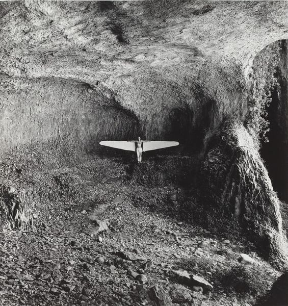 Editor: We’re looking at Dieter Appelt’s "Tableau Oppedette" from 1980, a gelatin silver print that feels incredibly staged, almost theatrical. What strikes me most is the contrast between the vast, stony landscape and the solitary figure inside the cave, but, ultimately, I have no idea what it means. What do you see here? Curator: Ah, yes, Appelt. He invites us into a dream, doesn't he? Or perhaps a nightmare, depending on your perspective! This isn’t simply landscape photography; it's a tableau, a constructed scene meant to evoke a feeling, a memory. The figure with outstretched wings... Do they offer protection, or are they trapped? And that cave… isn't it womb-like? A return? Editor: Trapped, definitely. It feels very… contained. Is the figure supposed to be an angel? Curator: Perhaps. Or maybe something more primal. The stark black and white, the textures of the stone… They echo ancient burial grounds, rituals we’ve forgotten. What is the figure facing? The dark unknown, or the rock of ages? Perhaps it's about vulnerability exposed. The artist bares his soul, setting up this landscape. It seems both desolate and oddly serene. Editor: Desolate for sure. So it's less about what is literally *there*, and more about the feelings it conjures? The sense of place is not as important as a state of mind? Curator: Precisely! Appelt wasn't after scenic vistas; he wanted to externalize internal landscapes. Each element - the figure, the cave, the stones, the monochrome tonality – becomes symbolic, each carries emotional weight. This is not only his subjective state of mind: but the feeling in all of us. This cave is both an ending and a beginning, isn't it? It's where the light both leaves, and where it starts to come into the picture. Editor: Definitely something to sit with. Thanks! I will leave some space to embrace the feelings.