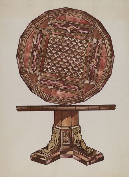 Curator: At first glance, it feels both functional and… some-how vulnerable. Editor: We are looking at a piece entitled "Indian Snow Shoe," dating from around 1937. It's rendered with watercolor and drawing, plus maybe coloured pencil too, capturing a Native American snowshoe. It seems so unassuming but these items meant survival in a harsh climate. Curator: Vulnerable isn't quite right… fragile is closer to how it makes me feel, especially given what I know about the time period, when native cultural objects were often collected as trophies. Editor: Yes, there's definitely that tension, that contrast, there. Focusing on the form itself, the circular shape likely represents wholeness, a connection to nature’s cycles, the Earth and sky, which would be in stark contrast with Western notions of utility. Curator: That reading connects strongly to how indigenous artifacts were—and in many ways still are—displayed and commodified, reduced to purely functional items rather than cultural objects that embodied rich spiritual meaning. What the West called "artifacts" were understood to be powerful tools of representation for those who created them, weren't they? Editor: Exactly! And let's also consider the materials themselves, rendered here with watercolor. We see the wood frame bound together with what looks like sinew or rawhide. Those elements, while simple, held profound importance, derived from the animals and plants of the local ecosystem, imbuing the snowshoe with a tangible sense of place and resourcefulness. A reminder that culture, survival and identity are inextricably linked to location. Curator: So it becomes more than just transportation across the snow. It transforms into a symbol of adaptability and resilience… Editor: ...carrying the weight of cultural endurance against the forces of colonization. A single footprint through time, perhaps? Curator: I think that's spot on. And for me, remembering the period in which this image was captured helps us appreciate what the artist has done, preserving cultural objects that were—are—at risk.