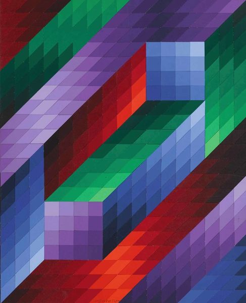 Curator: Looking at "Perspective chromatique," an acrylic on canvas work crafted by Martha Boto in 1972. Its interplay of color and form immediately grabs you, doesn't it? Editor: Grabs, maybe throws you right into a vibrant vortex! It's like peering down a multi-colored well or a psychedelic drainpipe. Unexpectedly cheerful. Curator: The hard-edge painting is so precise, almost clinical, yet those pulsating colors soften the austerity. Note the geometric abstraction – how the concentric squares recede, creating a definite illusion of depth. A superb deployment of Op Art strategies. Editor: Depth, yes, but there’s also this unsettling flatness, like it's all happening on a screen. I can’t quite decide if I’m moving into it or it’s expanding outwards to consume me. Curator: Precisely! It is this dialectic, this push and pull between the material flatness of the canvas and the illusionistic depth achieved through meticulous chromatic scaling, that Boto interrogates. The carefully chosen color combinations further heighten this effect, activating retinal afterimages and perceptual ambiguity. Editor: Perceptual ambiguity, I like that. For me, this feels deeply personal, like a journey inward filtered through this rigid, almost tyrannical grid. Do you think she was maybe mapping her own mental space, codifying her inner world? Curator: While biographical interpretations certainly have their place, focusing solely on them can eclipse a deeper engagement with the work's formal qualities. Her primary engagement is with the dynamics of perception. It challenges us to question the nature of sight, to reconsider how we apprehend spatial relationships. Editor: Well, I still sense something vulnerable under that hard shell. Perhaps it's the faint asymmetry or the tiny imperfections in color—cracks in the perfect facade. What do you take away from this piece, after all this time? Curator: The rigorous methodology, the analytical exploration of form and color. Boto reduces painting to its fundamental elements, building layer upon layer of controlled, systematic optical disturbance. It provides a lasting model. Editor: And I see a brave dance between order and chaos. "Perspective chromatique" makes you question your senses—and maybe, just maybe, find some unexpected joy in the wobble.